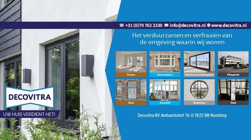 Het verduurzamen en verfraaien van de omgeving waarin wij wonen. Uw huis verdient het! Decovitra zorgt voor prachtige panden voor particulieren en projectontwikkelaars, projectinrichters en bouwbedrijven. Van kleinschalige woning renovaties, tot omvangrijke nieuwbouwprojecten. Van ultramoderne vliesgevels tot draai/kiepramen met het uiterlijk van oud Hollandse schuiframen. Decovitra levert de beste kwaliteit tegen de beste prijs. Wij hebben voor elke type kozijn het beste alternatief. Een eigen serviceafdeling in samenwerking met onze leveranciers staan dag en nacht voor u klaar. Ons doel is om maximale klantentevredenheid te realiseren, zodat wij er zeker van zijn dat u nog jarenlang plezier en vertrouwen heeft in uw raamkozijnen, deuren, schuifpuien en vliesgevels. De beste aanbevelingen en garanties die wij kunnen krijgen zijn die van onze klanten, architecten en aannemers die met ons samenwerken.